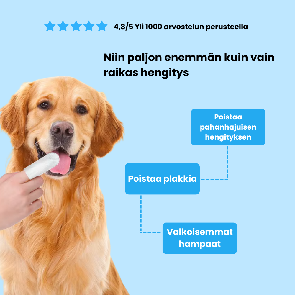 Päivittäisestä plakin poistosta eläinlääkärin hyväksymään raikkauteen, jokainen sormenjälkipyyhkeiden yksityiskohta on suunniteltu ehkäisemään kivuliaita hammassairauksia, välttämään riskialtista anestesiaa ja tuomaan takaisin ne läheiset, mukavat hetket .